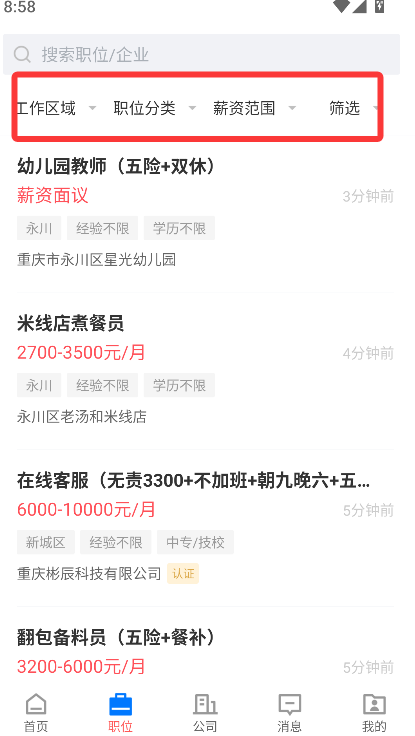 2、可根据行业类型、职位类别、工作地点、薪资范围等条件进行筛选,逐步缩小范围以定位适合个人需求的岗位。