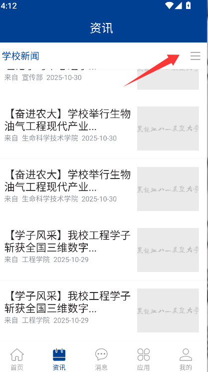 2、轻触屏幕上方的“三条横线”图标,即可展开功能菜单,从中选择“学校新闻”查询选项。