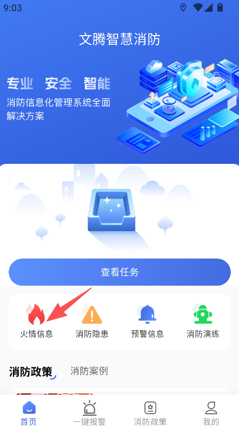 《文腾智慧消防》是一款专注消防信息化管理的软件,提供火情信息分类查看(未处理、已处理等状态)、隐患上报(填写名称、地点并提交)、消防演练发起等功能,还有消防政策、案例板块。助力用户开展消防管理与应急处置,是消防信息化的实用工具。