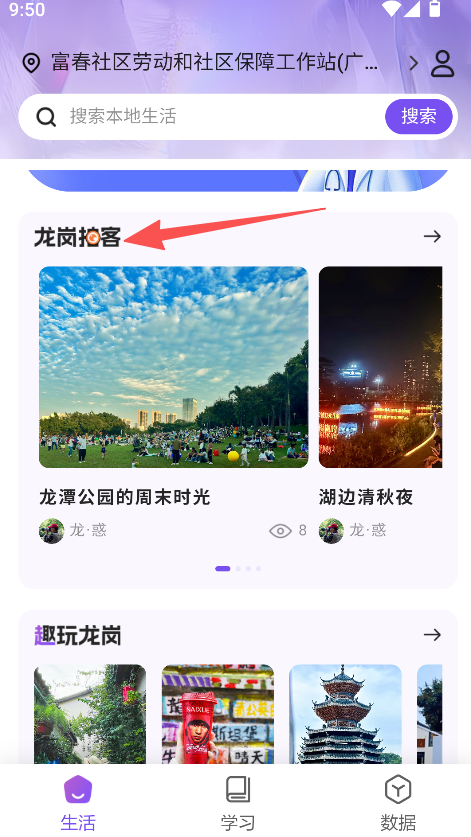 2、进入生活板块,浏览龙岗拍客等本地内容,了解生活场景。