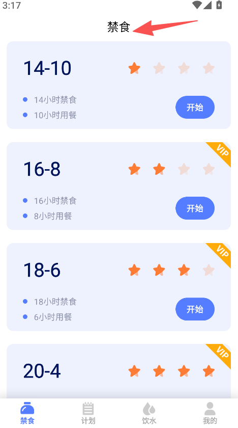 1、方案分级清晰,不同时段断食方案标注星级,难度一目了然,选择便捷。
