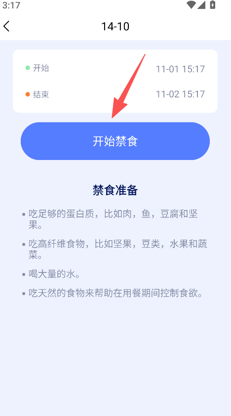 2、点击开始禁食,查看断食准备(如蛋白质、高纤维食物建议)。