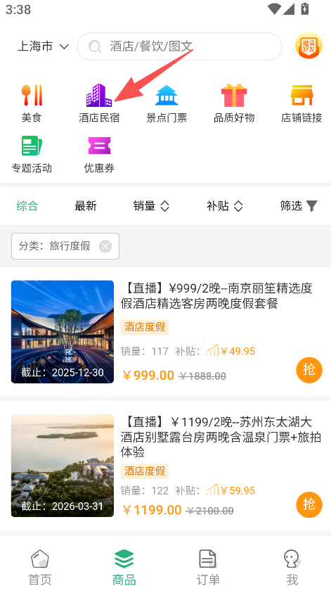 1、进入商品板块,点击酒店民宿,浏览目标商品。