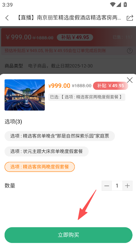《荟集生活》是一款专注本地生活服务的软件,设有酒店民宿、景点门票等板块,用户可选择目标商品(如南京丽笙度假酒店套餐),查看商品选项(如房型套餐),点击立即购买完成消费。助力用户选购本地优惠商品、了解服务细节,是本地生活服务的实用工具。