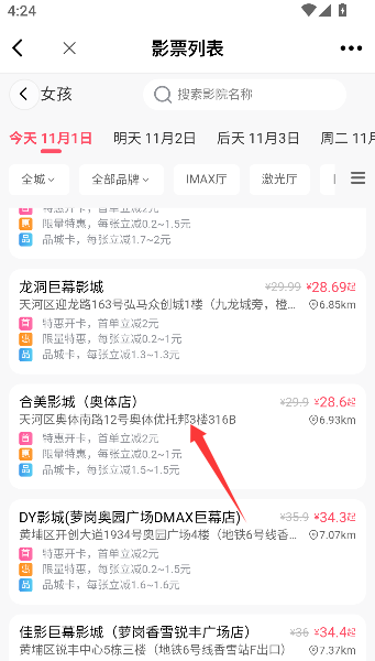 3、地图上会蹦出周边多家影院选项,挑选最方便的那个作为根据地,确认场次和座位后即可完成这次愉快的购票行动。