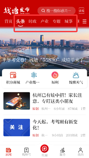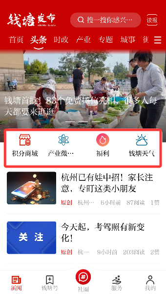 2、首页中部藏着惊喜百宝箱,积分商城、福利活动、钱塘天气一字排开,日常福利与生活指南触手可及。
