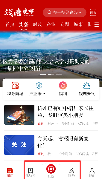 3、页面底部宛如城市会客厅,钱塘号、社圈、服务三大板块稳如基石,轻松串联起本地生活全链路。