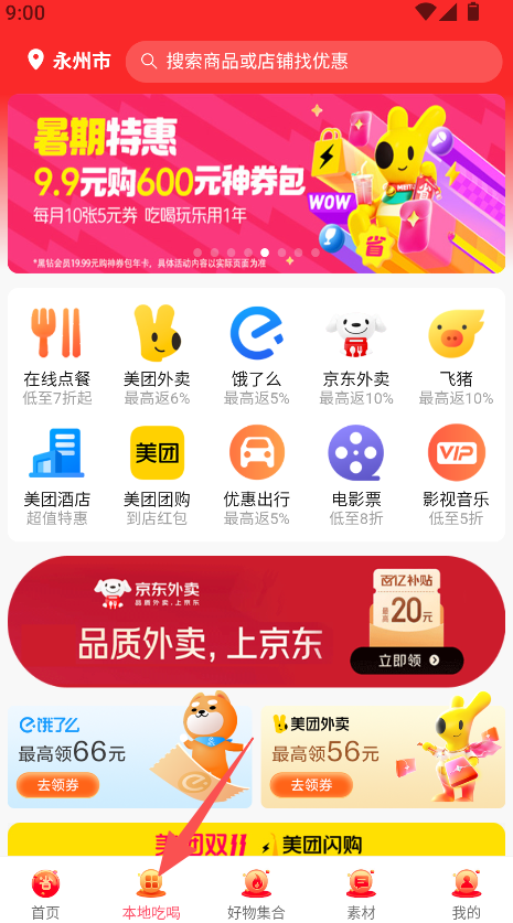 1、点击本地吃喝或美食板块,进入在线优惠点餐页面。