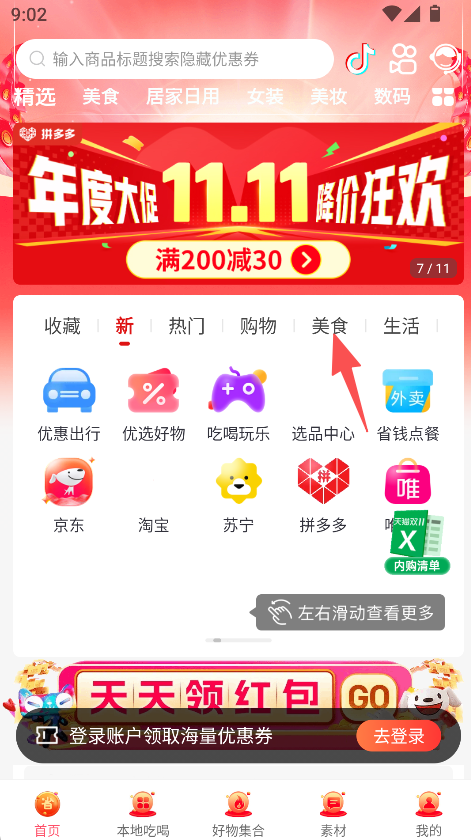 3、在首页选择外卖、电影票等板块,领取优惠进行消费。