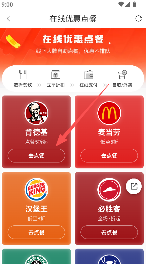 2、选择肯德基、麦当劳等餐饮商家,点击去点餐享受折扣。