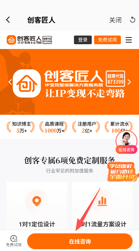 2、在创客匠人页面点击在线咨询,进入沟通界面。