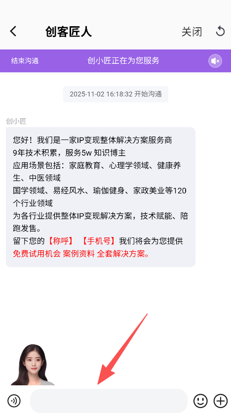 3、在沟通界面输入信息,获取IP变现解决方案及案例资料。