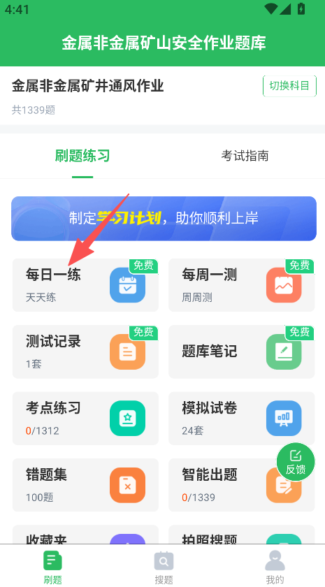 1、聚焦金属非金属矿山安全作业备考,题库涵盖矿井通风等科目,设有每日一练、模拟试卷等多样练习板块。