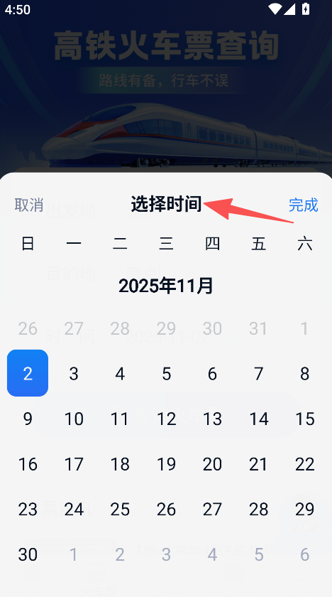 1、选择出行时间,在日历中选定日期后点击完成,进入车次查询页面。