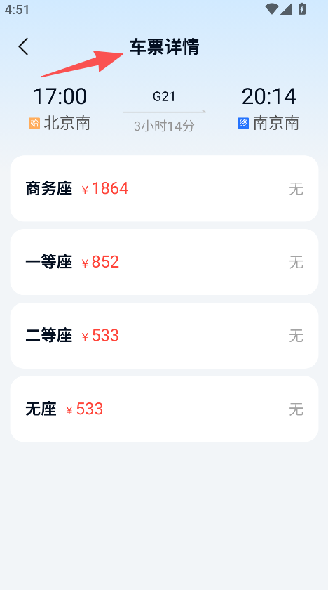 3、提供详细车票详情,各座位类型票价清晰呈现,让用户全面掌握车次票务信息。