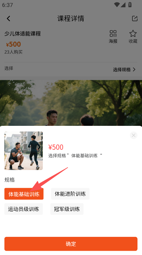 3、在课程详情中选择体能基础训练,点击确定完成课程预约。