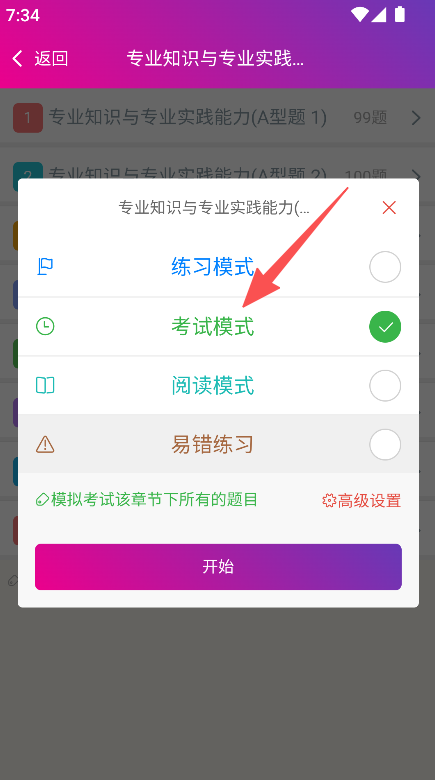 3、选择考试模式,点击开始,进行模拟考试练习。