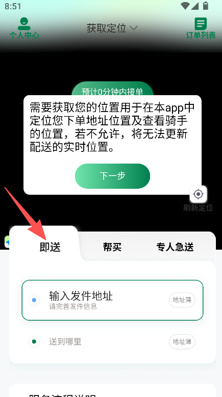 1、 服务类型清晰,即送、帮买、专人急送板块明确,快速找到所需配送服务,操作路径简单。