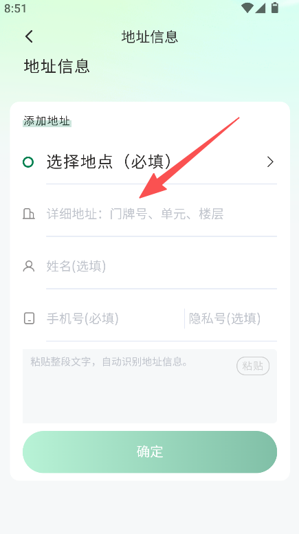3、选择地点,填写详细地址、手机号等,点击确定,完成地址设置。