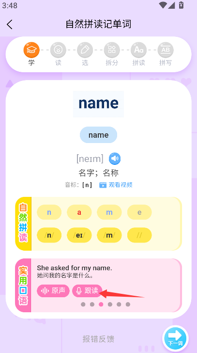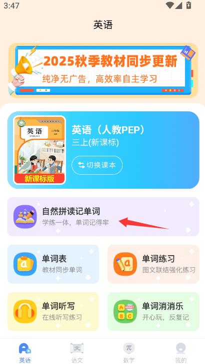 1、在主功能模块中选择并点击“自然拼读记单词”入口,即可进入专门的单词学习主页面。