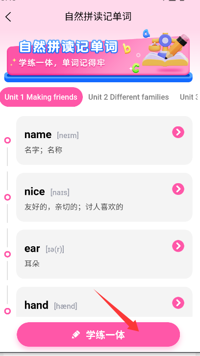 2、找到并点击“学练一体”功能按钮,系统将引导进入一个结合单词学习与即时练习的综合训练界面。
