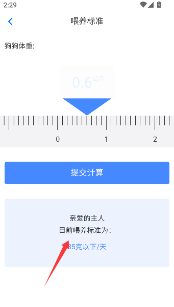 2、看到那只可爱的卡通尺子了吗?把蓝色小标识拖来拖去,对准你家狗主子的实际体重,别虚报哦。