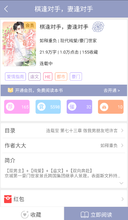 1、选定感兴趣的小说后,点击该书条目即可进入包含简介、封面等信息的详情界面。