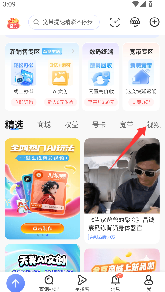 1、在中国电信宽带首页,找到那个引人注目的小电视图标“视频”,用指尖轻轻戳中它。