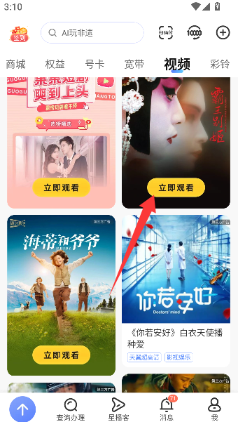 2、眼前弹出琳琅满目的视频墙,上下滑动挑选最合眼缘的节目,果断点击“立即观看”按钮。