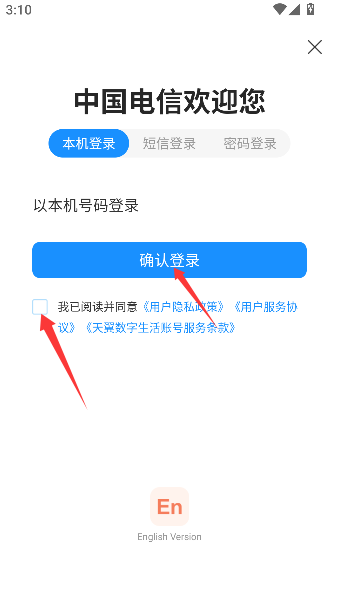 3、在弹出页面找到隐私政策条款,郑重打上勾勾,再点击确认登录,就握紧观影通行证啦。