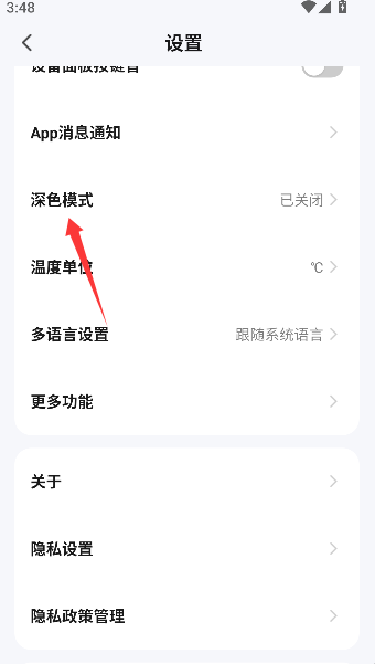 3、进入设置页面后,在菜单中找到“深色模式”这个选项,轻轻一点就能给软件换上酷酷的夜间装扮啦。