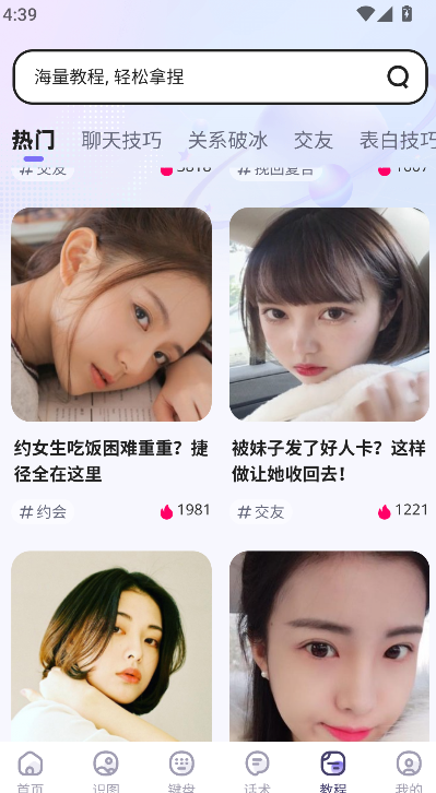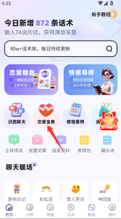 1、在屏幕导航栏中,找到并点击恋爱宝典”图标,进入话术库界面。