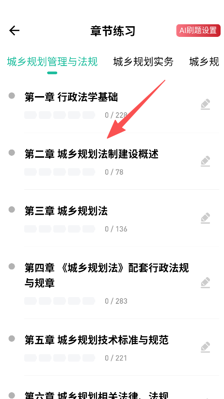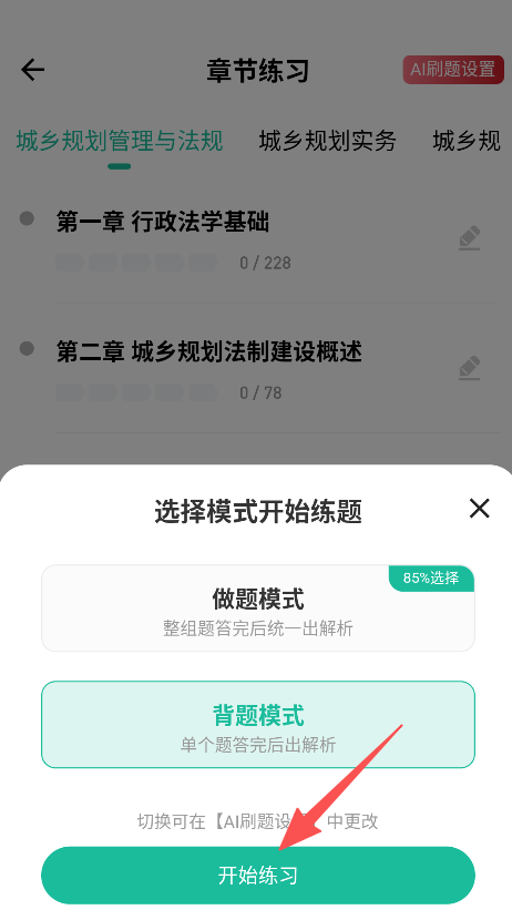 2、选择具体章节,如城乡规划法制建设概述,进入练题模式选择界面。