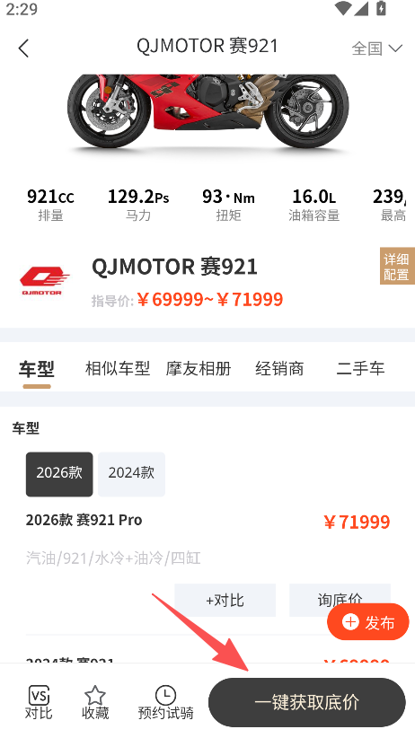 《摩托社》是一款服务摩托爱好者的软件,涵盖摩托车、电动车、二手车选车板块,提供上市新车资讯,如QJMOTOR赛921的详细配置与价格,还有排行榜、俱乐部、社区等功能,支持车型对比、预约试骑、一键获取底价,让用户轻松选车、了解行业动态、结交摩友。