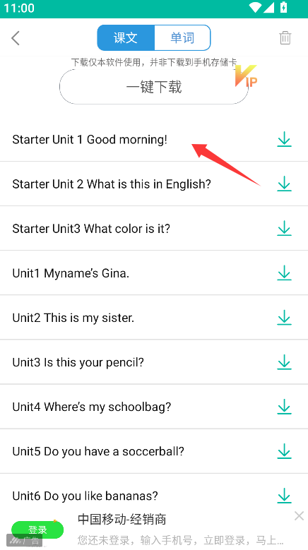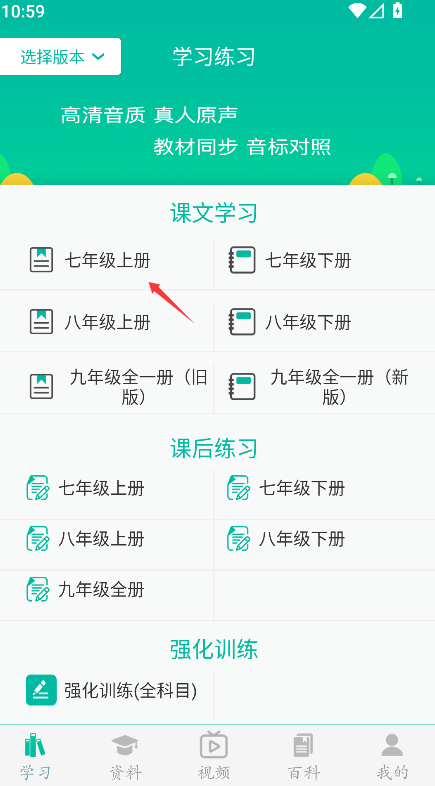 3、 资料下载完成后,即可进入该章节的学习界面,按照指引完成听说读写等各项练习任务。