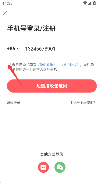 2、郑重勾选隐私政策并点击获取验证码,如同签订一份友好互助条约,即刻收获数字通行证。