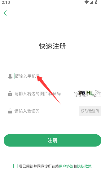 1、打开诊所在线应用,在首页输入手机号码,就像为健康档案柜申领一把专属的电子钥匙。