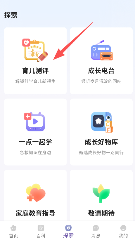 1、打开软件,进入探索板块,点击育儿测评,进入测评列表。