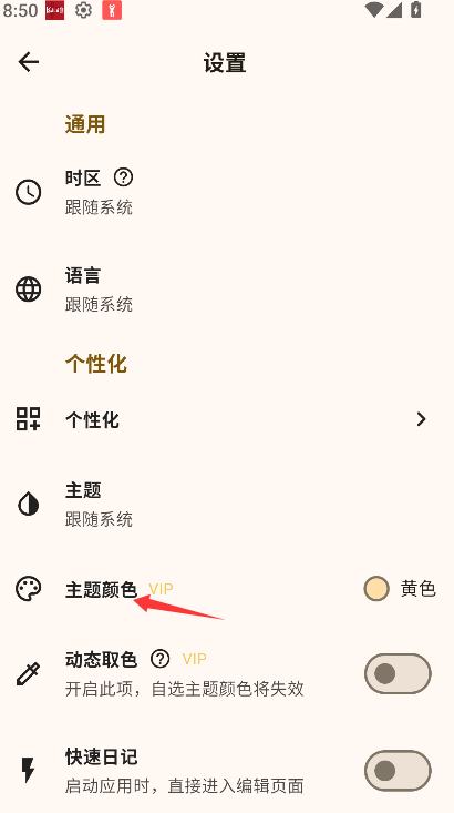 3、在设置菜单中找到"主题颜色"选项,点击后会出现颜色选择面板,从中选取需要的主题色彩即可完成个性化设置。