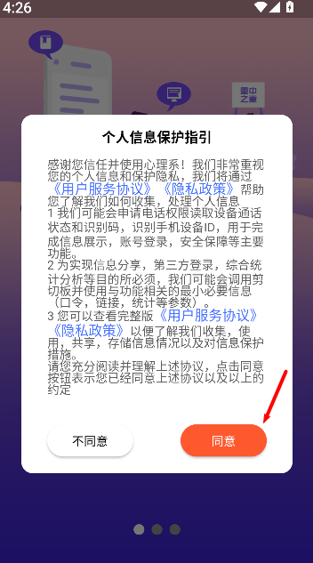1、打开下载完成的app后进入初始界面,在出现的服务说明页面点击“同意”进入主界面。