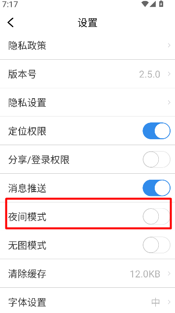 3、在设置页面中找到“夜间模式”开关,将其开启即可切换为深色界面,适合在光线较暗环境下浏览使用。