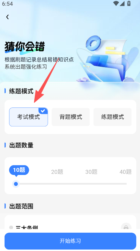 1、打开软件,选择练题模式,设置出题数量,点击开始练习。