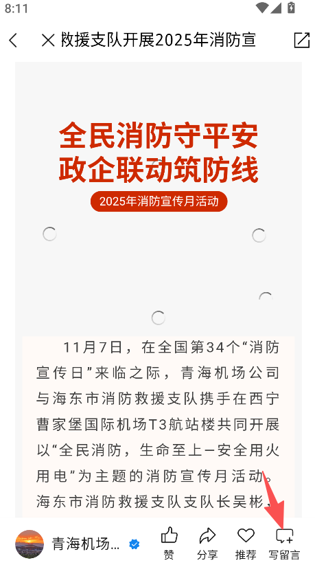 1、打开软件,选择新闻(如消防宣传资讯),进入详情页。