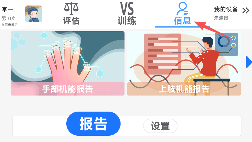 1、进入信息板块,查看手部、上肢机能报告,了解机能概况。