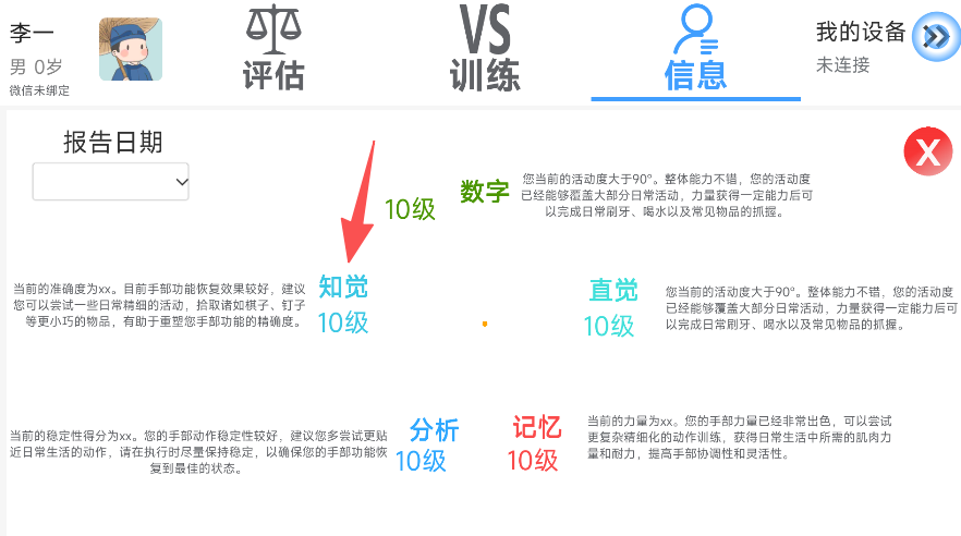 3、实现等级说明功能,知觉、数字等机能等级展示与说明,康复训练方向明确,机能提升路径清晰。