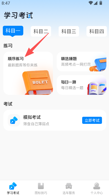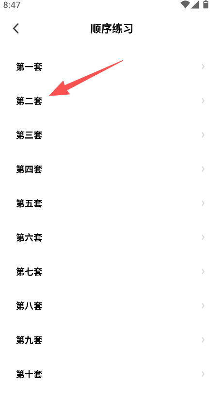 1、打开软件,选择科目,点击顺序练习,选择套题,进入刷题页面。