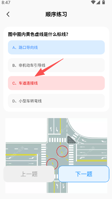 2、在刷题页面,选择题目答案,点击下一题,持续刷题巩固知识。