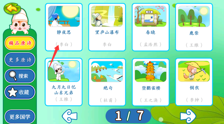 1、通过点击任意一首诗的标题或插图,即可进入该首诗的详细学习界面。