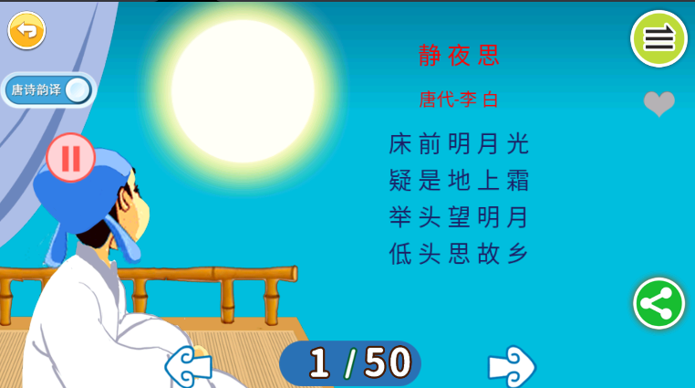 3、通过精美的动画和好听的声音激发宝宝的兴趣,让您的宝宝快乐学唐诗。