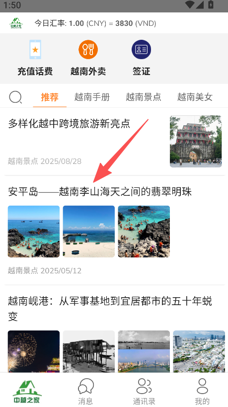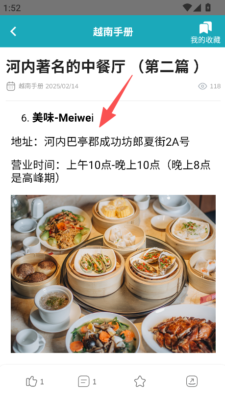 3、进入越南手册,查看河内中餐厅等实用信息,获取当地生活指南。